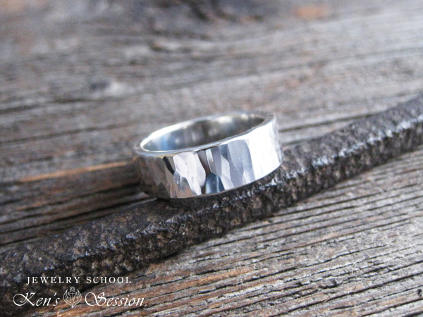 平打ちのシルバーリングを制作し、ハンマーで叩き、鎚目をつけます。 手作り感あふれる作品が仕上がります。